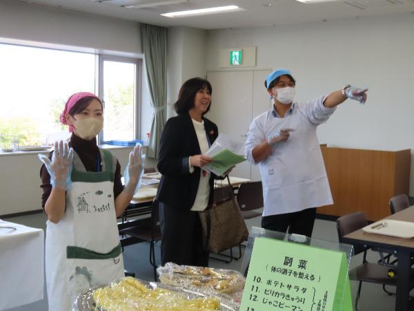 学校給食では、子ども達が食べる前に、給食が問題ないか確認する「検食」という仕事があります。配送先の各学校では校長先生がして下さっています。給食センターでは学校よりもさらに早く、職員が検食しますが、この日は通常給食に加え、バイキング給食分もあるので、二名で安全を確認しました。