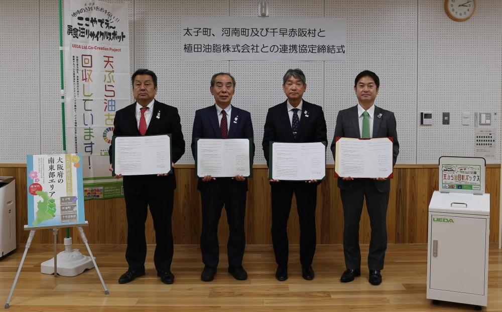 太子町、河南町、千早赤阪村と植田油脂株式会社が、家庭用廃食油のリサイクルを推進するとともに、住民等の環境意識の向上を図り、循環型社会の実現に資することを目的に連携協定を締結しました。