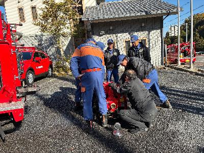 この点検は、団員と点検業者が可搬ポンプの始動から放水までの操作を確認し、エンジン始動とポンプ作動の主要部の点検を入念に行い、いざという時に使用できない状況にならないために行います。住民を火災から守るため、これからも適正な維持管理に努めます。