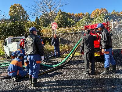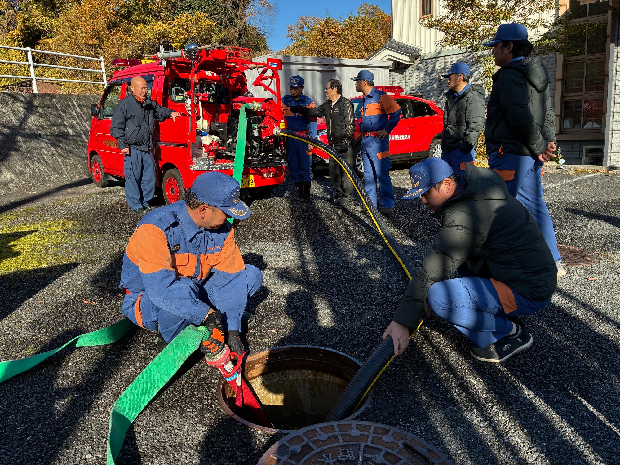 訓練は消防ポンプ車と可搬ポンプ合わせて8台で火災や災害時に遠距離で水を送る中継を実施。ホースを40本繋ぎ水を送りました。